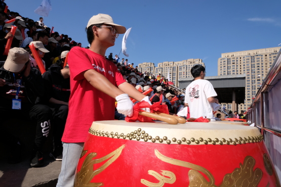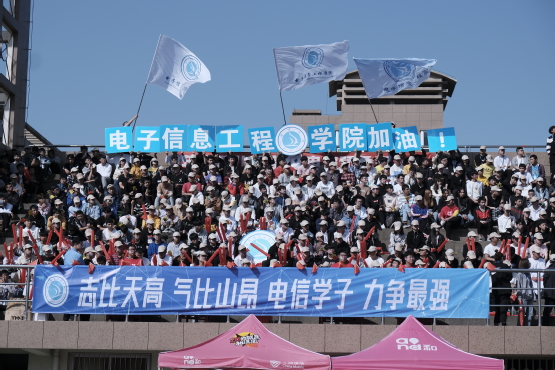 赛场上运动员们奋力拼搏,观众席上同学们热情呐喊。震耳欲聋的鼓声,直冲云霄的呐喊声,那高昂的加油中带着永不服输的决心,声声入耳。鼓手们干劲十足,不断地敲打着大鼓,拉拉队员们高喊着口号:“电信学院,勇往直前,势不可挡,锐不可当!”同学们手中的加油棒不断挥舞着,飘扬在蓝天下的院旗显得格外的耀眼。日晒风吹,始终坚守,为奋斗的运动员们献上最热情的鼓舞和最真挚的祝愿。