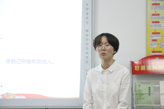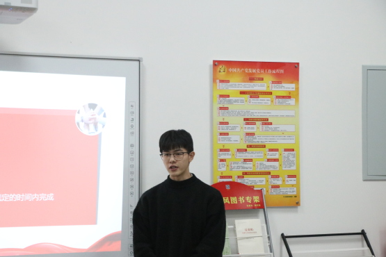 本次答辩共分两部分进行,第一环节为答辩对象上台自我介绍,并结合PPT展示自我风采。在这一环节中,同学们都以学习、生活和思想等方面来介绍自己在入党前作为一名积极分子的状态,尤其是政治素养方面。同学们大都强调了自己在各大学生组织开展学生工作和课余进行志愿服务活动中努力增强自己的服务意识。第二环节为评委提问环节,此环节有助于更好的了解同学们,主要从其个人各方面包括思想、学习、工作等方面结合入党动机、党员先进性、时事政治以及党的基础理论知识提问。