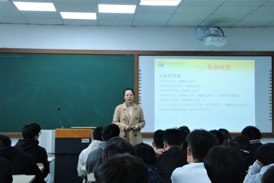 会议伊始,应奏飞老师首先向同学们介绍资助种类,分别是政府资助和校内资助。其中,政府资助包括国家奖学金、国家励志奖学金、省政府奖学金等;校内奖学金则有综合奖学金、技能竞赛奖学金和体艺奖学金等。学校还专门为经济情况较困难的学生安排了勤工俭学、开通了绿色通道、临时性困难补助以及其他补助,并且还呼吁同学们要积极参与到发展性资助项目中去。应奏飞老师还讲到资助项目活动中36月为“感恩季”系列活动,6月为“诚信教育”系列活动,不日将在电子信息工程学院依次举行。
