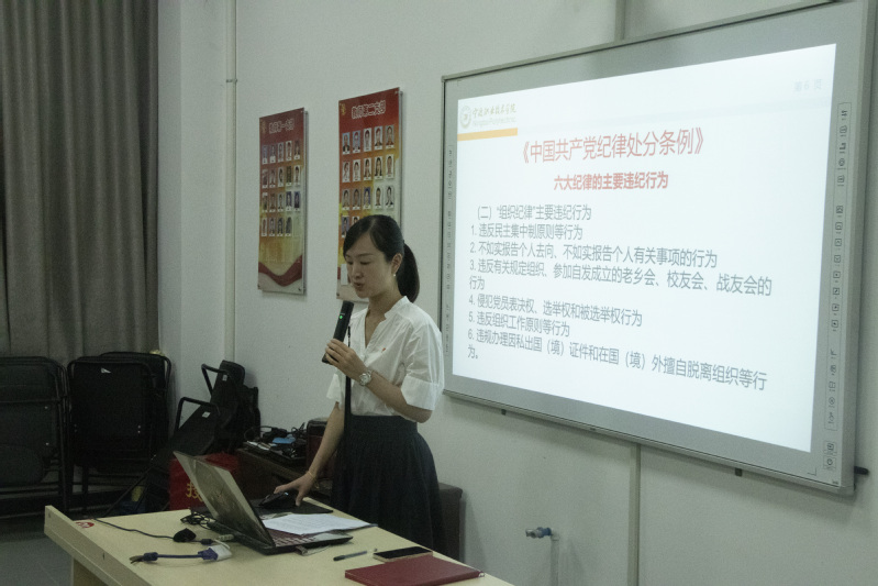 大会开始前,首先由电子信息工程学院党总支书记赖敏雅老师带来党课——《扣好人生的第一粒扣子》,赖老师为党员师生们解读了《中国共产党廉洁自律准则》,并通过多个真实的案例为毕业生党员开展了廉洁从业教育。