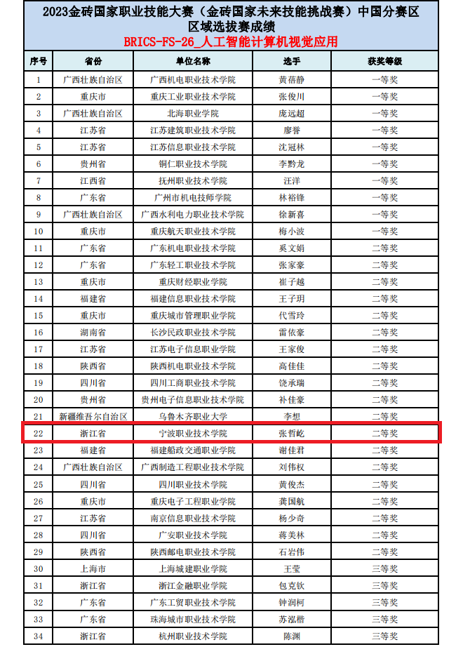 经过前期不断努力与备赛,最终,功夫不负有心人,由潘婕老师作为指导老师带领的人工智能3224班的张哲屹同学从95名同学中脱颖而出,夺得2023金砖国家职业技能大赛(金砖国家未来技能挑战赛)人工智能计算机视觉应用中国分赛区区域选拔赛二等奖,浙江省第一名,并成功进入2023金砖国家职业技能大赛(金砖国家未来技能挑战赛)人工智能计算机视觉应用中国分赛区决赛。