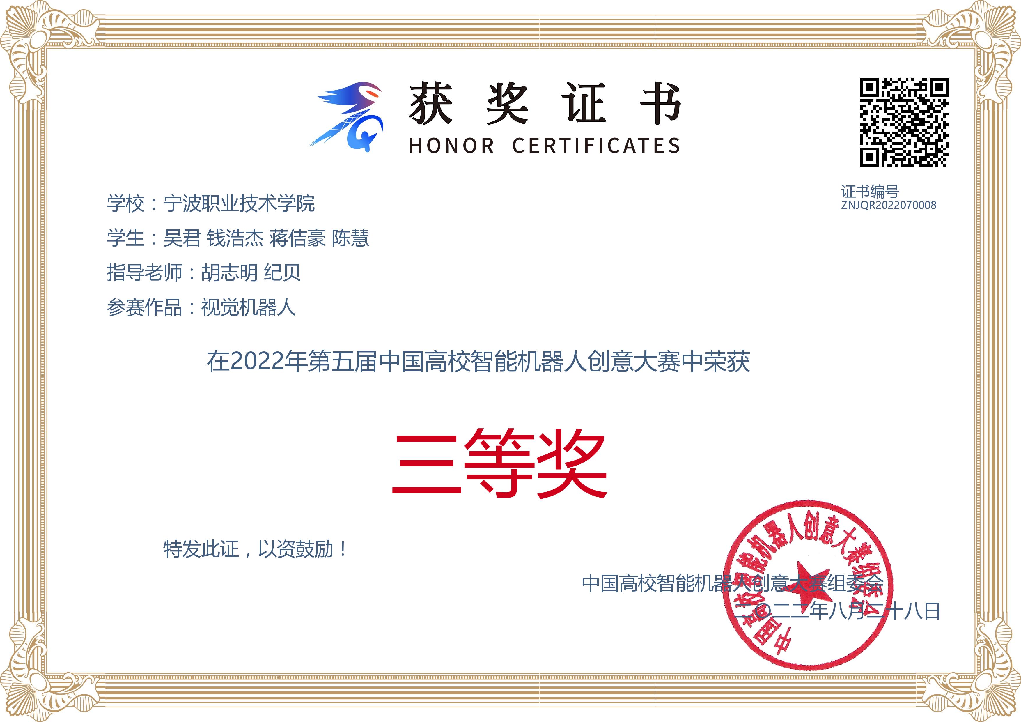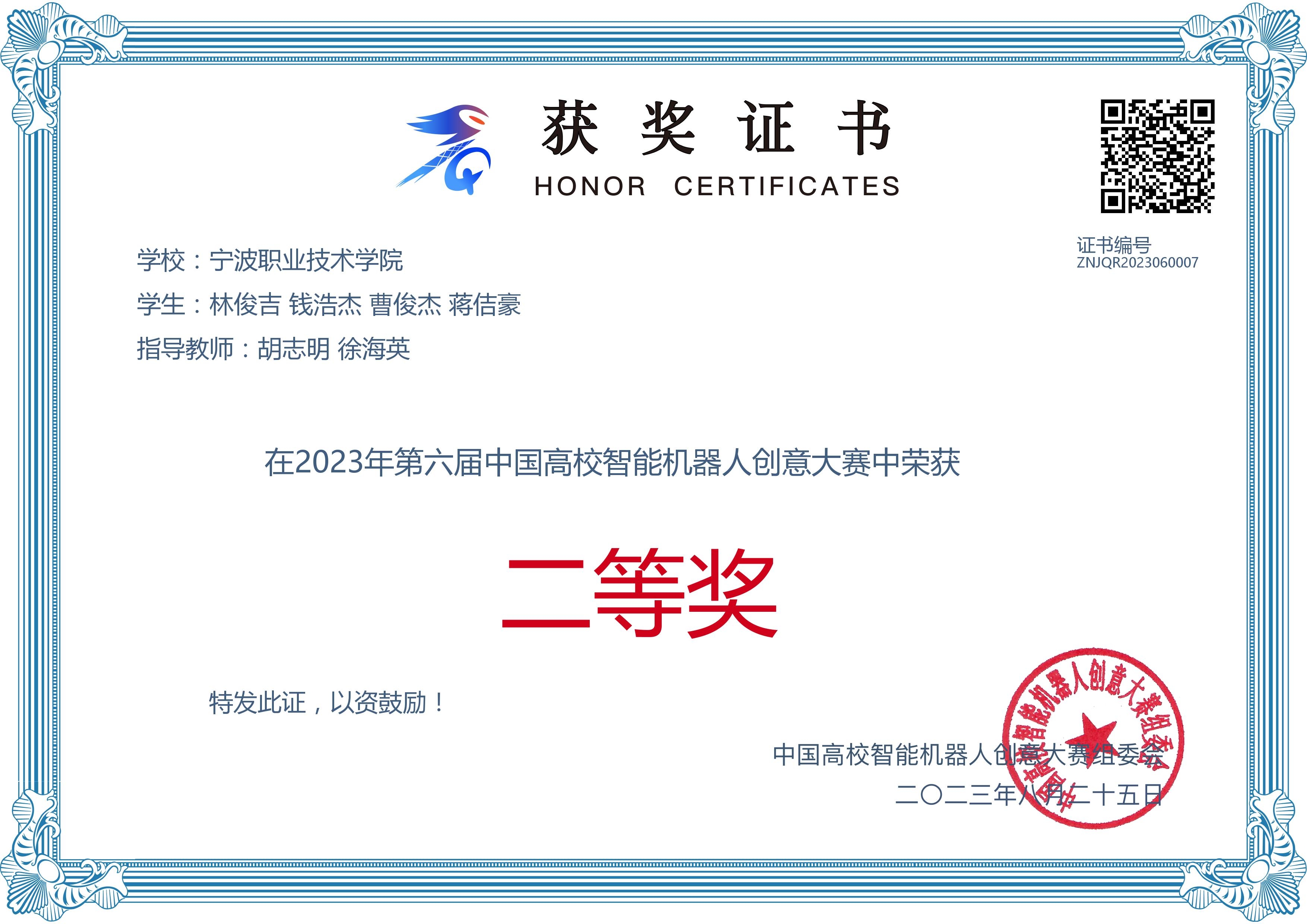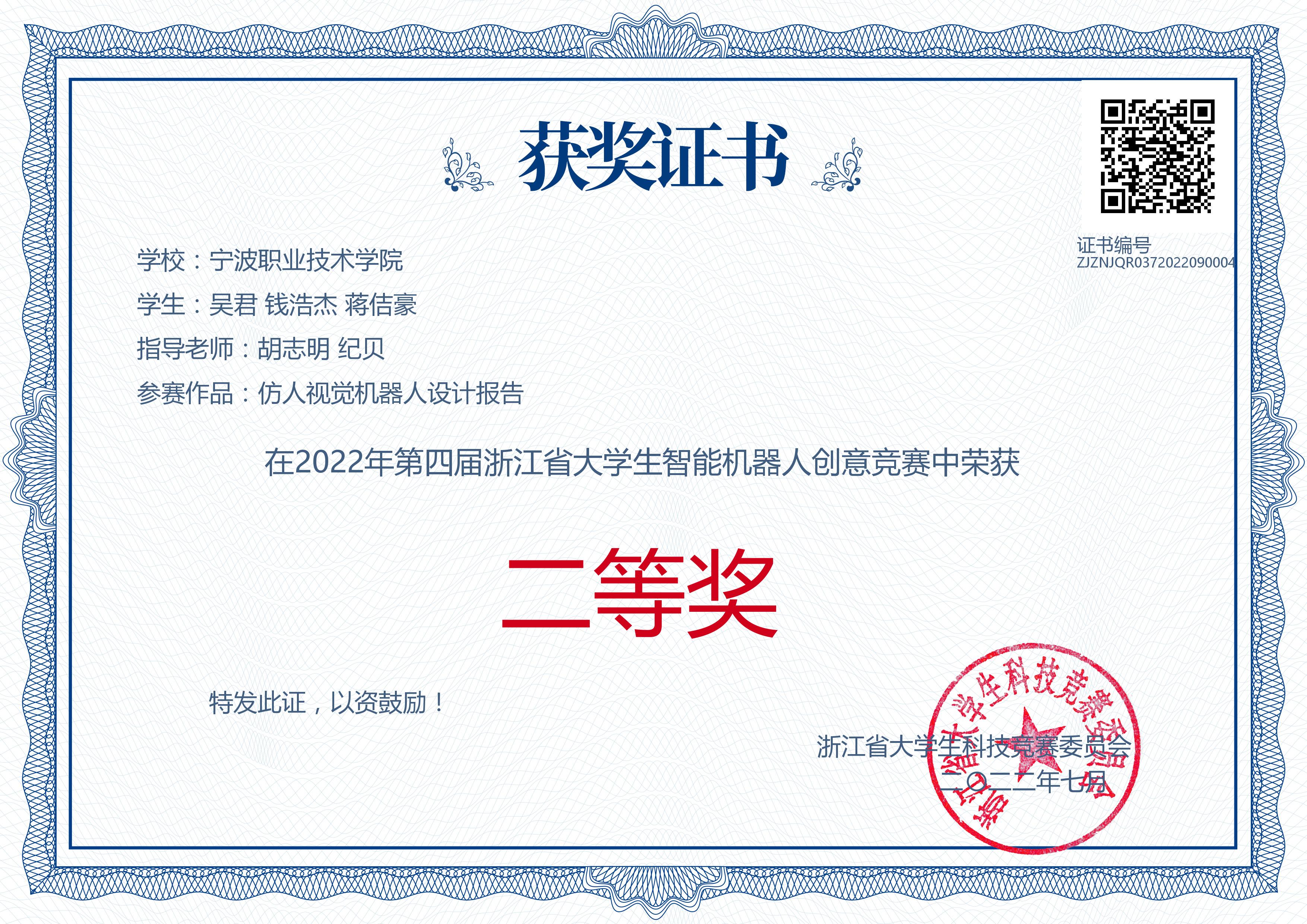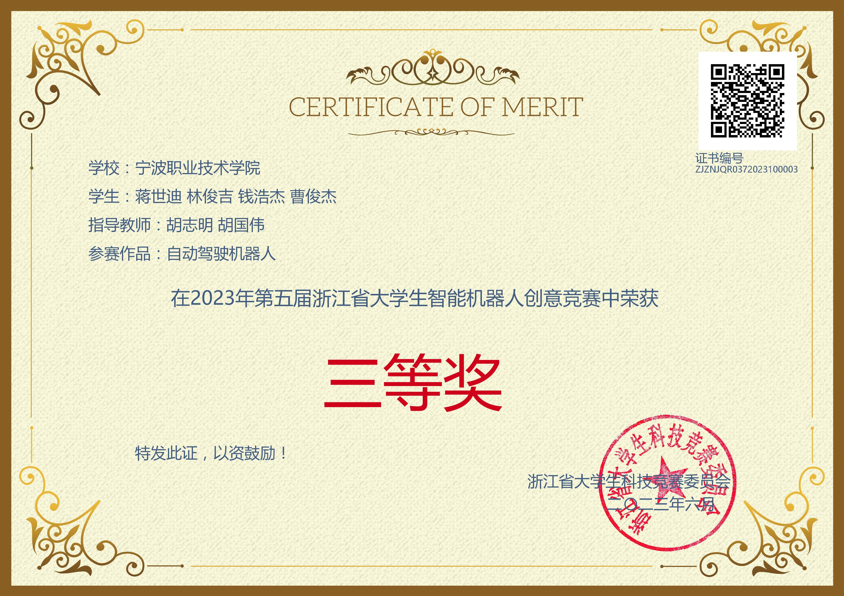 大学两年期间,他先后获得 “国家励志奖学金”、“优秀学生干部”等荣誉,并且在专业技能方面突出,比赛获得“2022年浙江省大学生电子设计竞赛一等奖”、“2022年全国职业院校集成电路赛项荣获一等奖”、“2023年一带一路金砖技能大赛国家一等奖”等,在创新方面曾获“浙江省第四届大学生智能机器人创意竞赛—仿人视觉机器人设计报告二等奖”、“第五届中国高校智能机器人创意大赛—视觉机器人三等奖”、 “第五届中国高校智能机器人创意大赛—仿真机器人三等奖”、“浙江省第四届大学生智能机器人创意竞赛—仿真机器人二等奖”、“第六届中国高校智能机器人创意大赛二等奖”、“浙江省第五届大学生智能机器人创意竞赛—体感机器人二等奖”、“第五届中国高校智能机器人创意大赛—自动驾驶机器人”等荣誉。