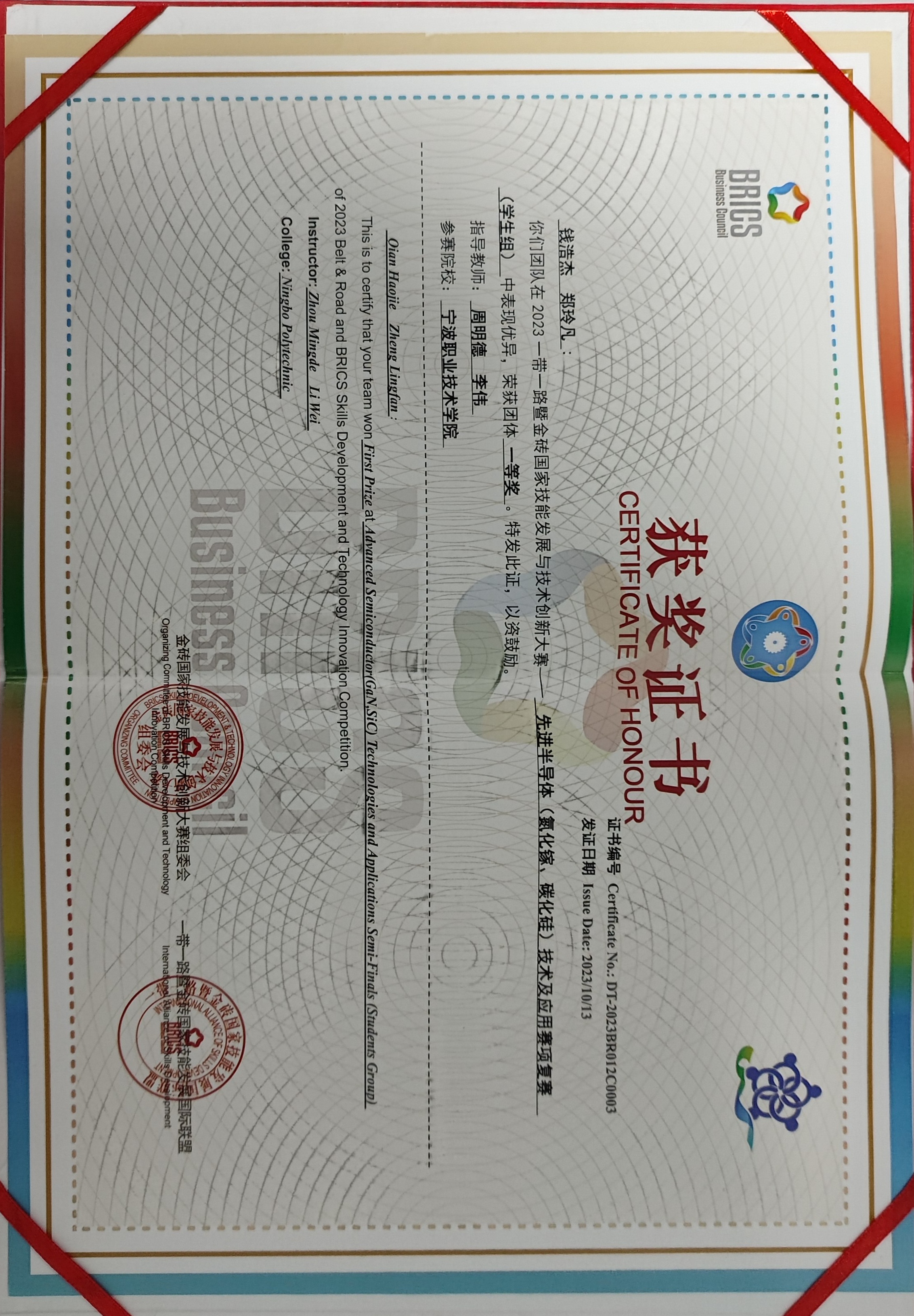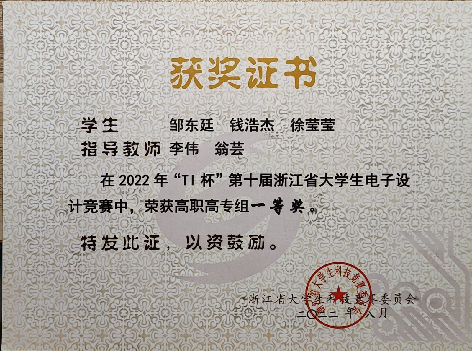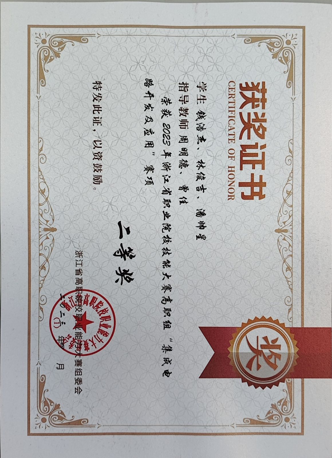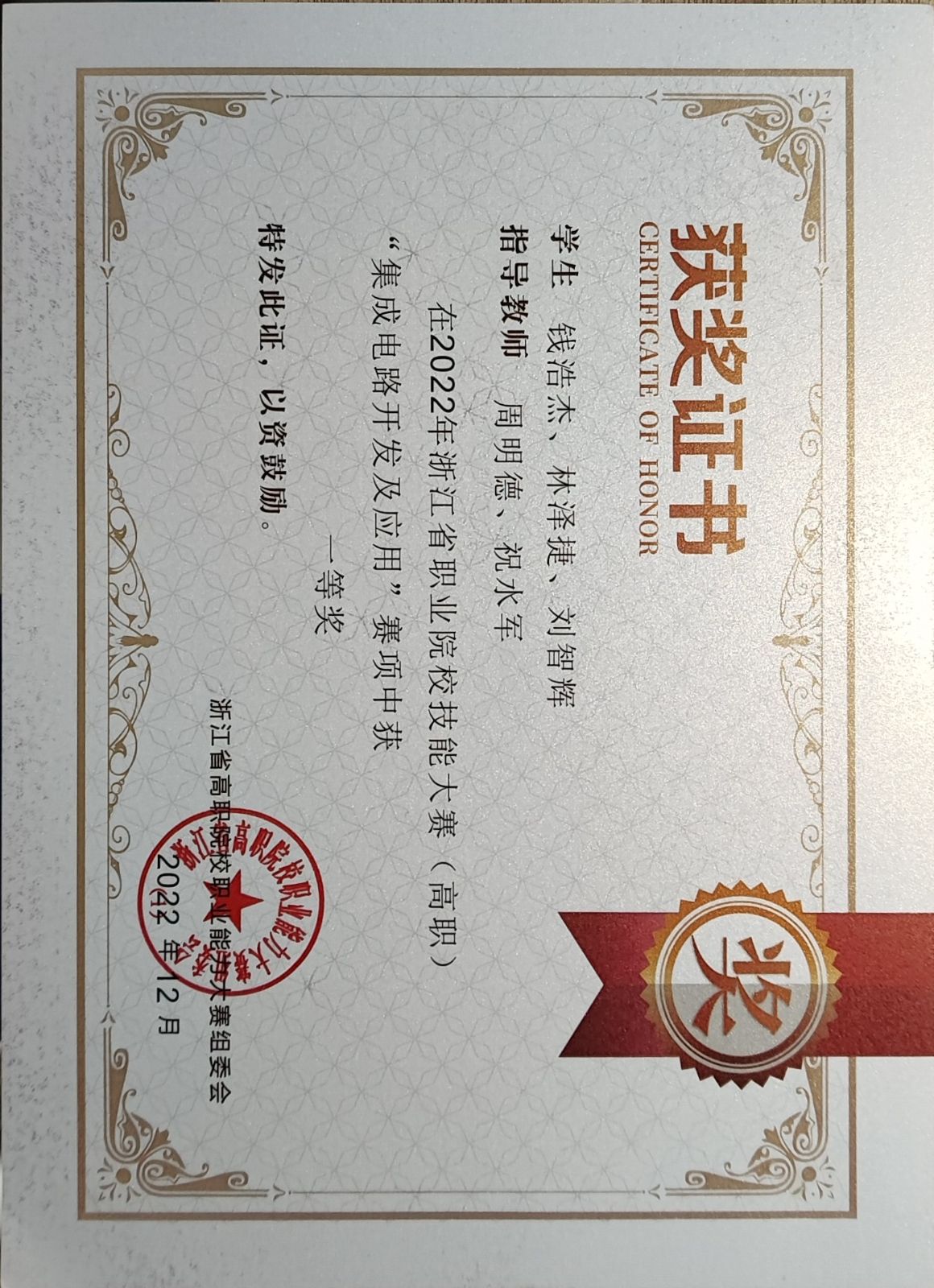 大学两年期间,他先后获得 “国家励志奖学金”、“优秀学生干部”等荣誉,并且在专业技能方面突出,比赛获得“2022年浙江省大学生电子设计竞赛一等奖”、“2022年全国职业院校集成电路赛项荣获一等奖”、“2023年一带一路金砖技能大赛国家一等奖”等,在创新方面曾获“浙江省第四届大学生智能机器人创意竞赛—仿人视觉机器人设计报告二等奖”、“第五届中国高校智能机器人创意大赛—视觉机器人三等奖”、 “第五届中国高校智能机器人创意大赛—仿真机器人三等奖”、“浙江省第四届大学生智能机器人创意竞赛—仿真机器人二等奖”、“第六届中国高校智能机器人创意大赛二等奖”、“浙江省第五届大学生智能机器人创意竞赛—体感机器人二等奖”、“第五届中国高校智能机器人创意大赛—自动驾驶机器人”等荣誉。