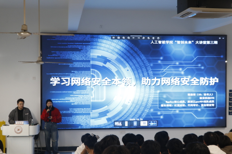 为进一步提高我院学子对网络安全的认识,强化在数字时代的网络安全意识和防护技能,10月31日下午,人工智能学院在2#401教室开展“智创未来”大讲堂第三期暨计算机网络技术、信息安全技术应用专业2024级学生始业教育讲座。主讲人为极安科技CTO程康荣老师,180名学生聆听讲座。