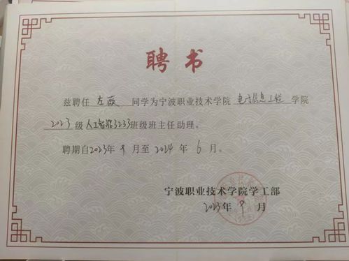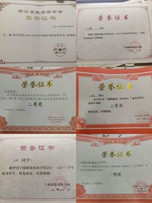 左薇积极投身于各类校园文化活动之中,她在大一时加入了校书法协会,通过不断的学习和实践,她在校书法大赛硬笔组比赛中荣获三等奖,在学院举办的书法比赛中荣获一等奖。除了书法,左薇同学还热爱写作,她在宁波职业技术学院及分院举办的征文比赛中,她均凭借优秀的作品荣获二等奖,同时,她还在分院绘画竞赛中获得了一等奖,用画笔描绘出了她心中的美好世界。此外,左薇在分院简历制作大赛中荣获二等奖。