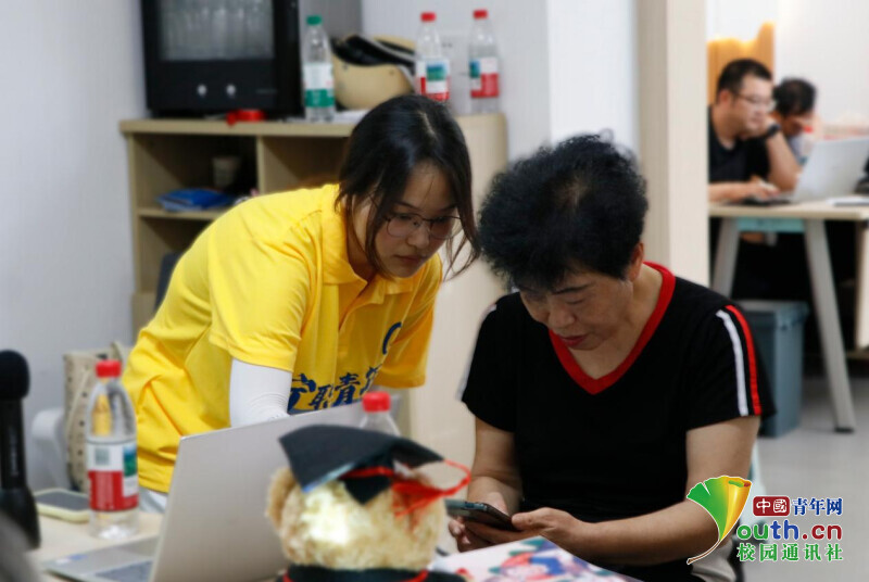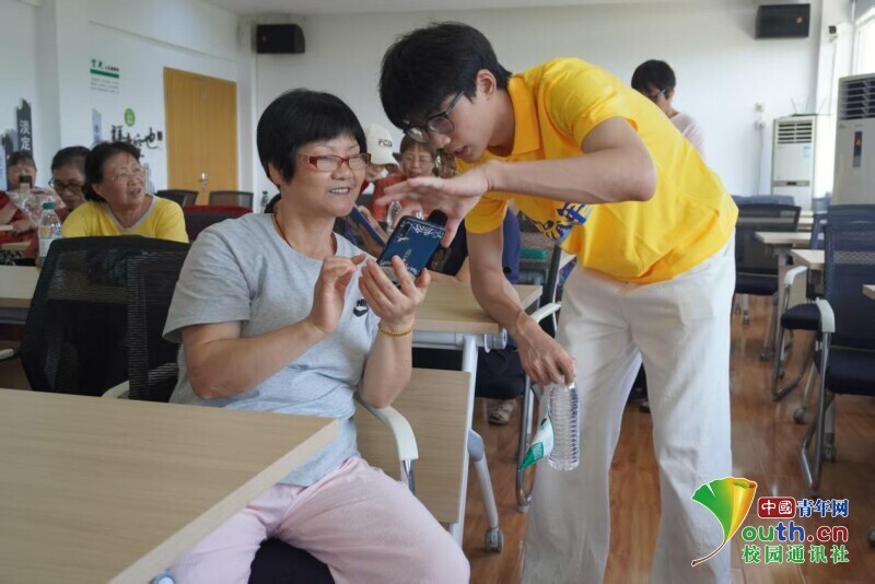 图为团队成员邹嘉浩为老奶奶讲述如何找到应用商店。吴逸瑜供图