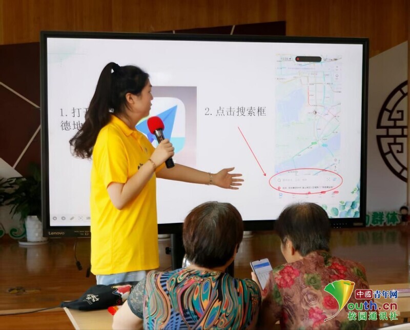 图为团队成员陈羽晗讲解如何利用高德地图出行。杨扬供图