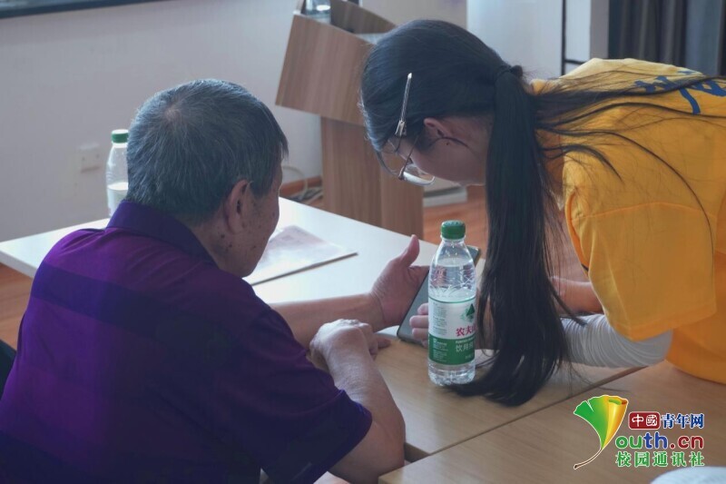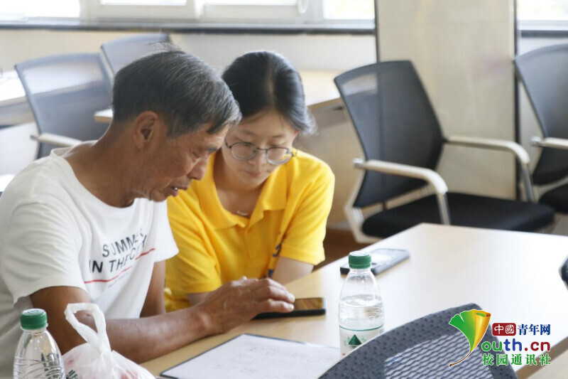图为团队成员留梓菡帮助老人找到微信中出行的位置。陈以琳供图