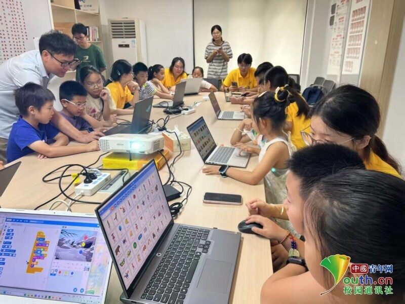 图为团队成员们协同小朋友学习Scratch软件。杨扬 供图