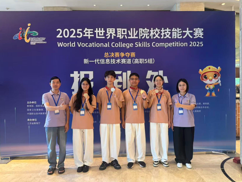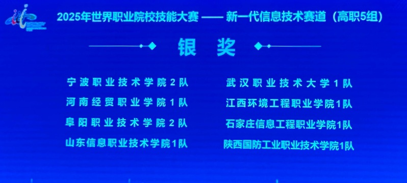 2025年9月7日至12日,世界职业院校技能大赛争夺赛新一代信息技术赛道高职组在常州五所职业院校同步举行,吸引了来自全国208所高职院校、251支参赛队伍同台竞技。经过激烈角逐,我校人工智能学院李宏铭、杜娟、王诗迢、李群等老师指导的蒋李波、吴涵琦、苏彤彤、朱慧慧团队在高职5组赛场脱颖而出,荣获团体二等奖(银奖)。