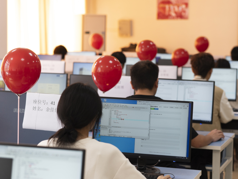 现场比赛采用ACM赛制,以解题数量和提交时间作为评分标准,考验选手的编程功底、算法设计能力。赛场上,选手们专注投入、沉着思考,指尖在键盘上敲击,一行行代码化作破解难题的密钥;每当成功提交正确代码,对应颜色的气球便会及时送达,这些气球既是对解题成果的肯定,也为气氛紧张的赛场增添了一抹灵动色彩。